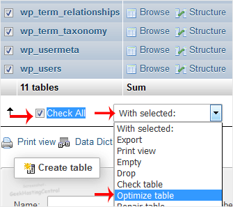 4. Scroll down and mark Check All. Click on the drop-down option and select Optimize tables.